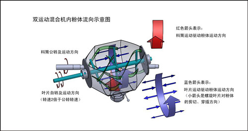 假颗粒是指因为结块、静电、潮湿粘结等原因使粉体抱团,传统混合机不易打开它,因而影响混合质量。而双运动混合机内部八个螺旋叶片对物料有剪切,穿插的作用,速度较快,可以直接打开抱团的假颗粒。